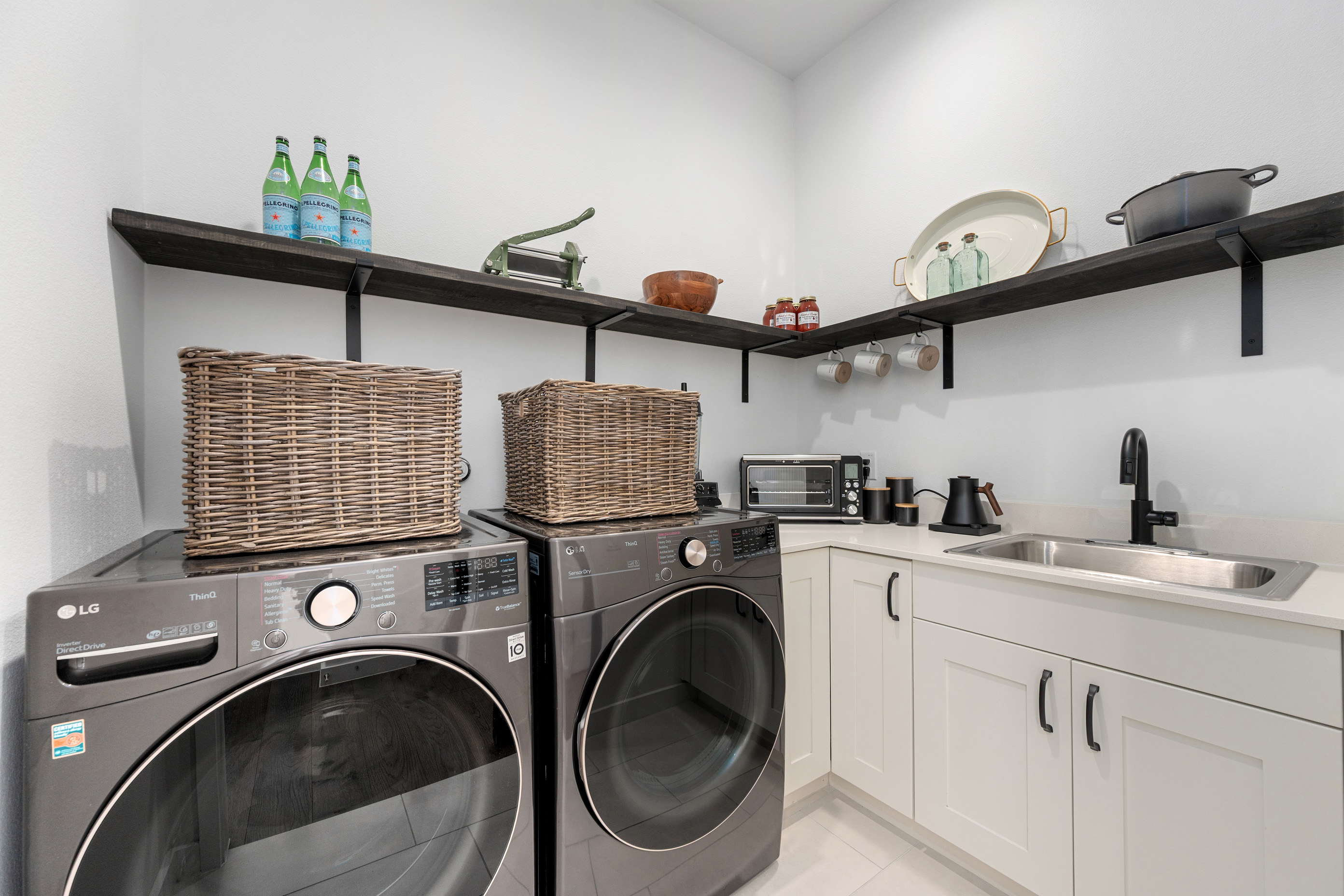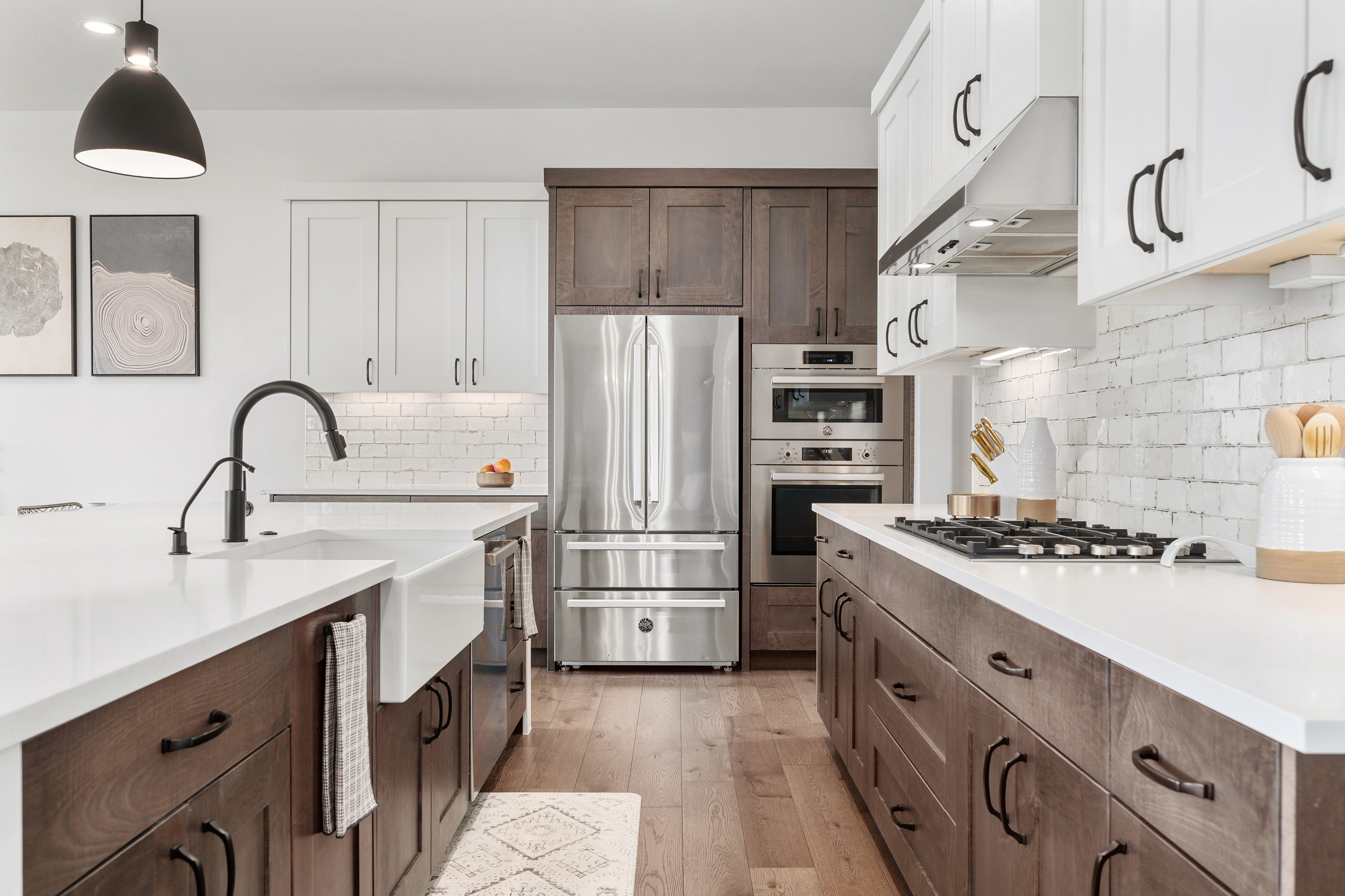 • Five-burner gas range, double ovens, farmhouse sink, expansive walk-in pantry
