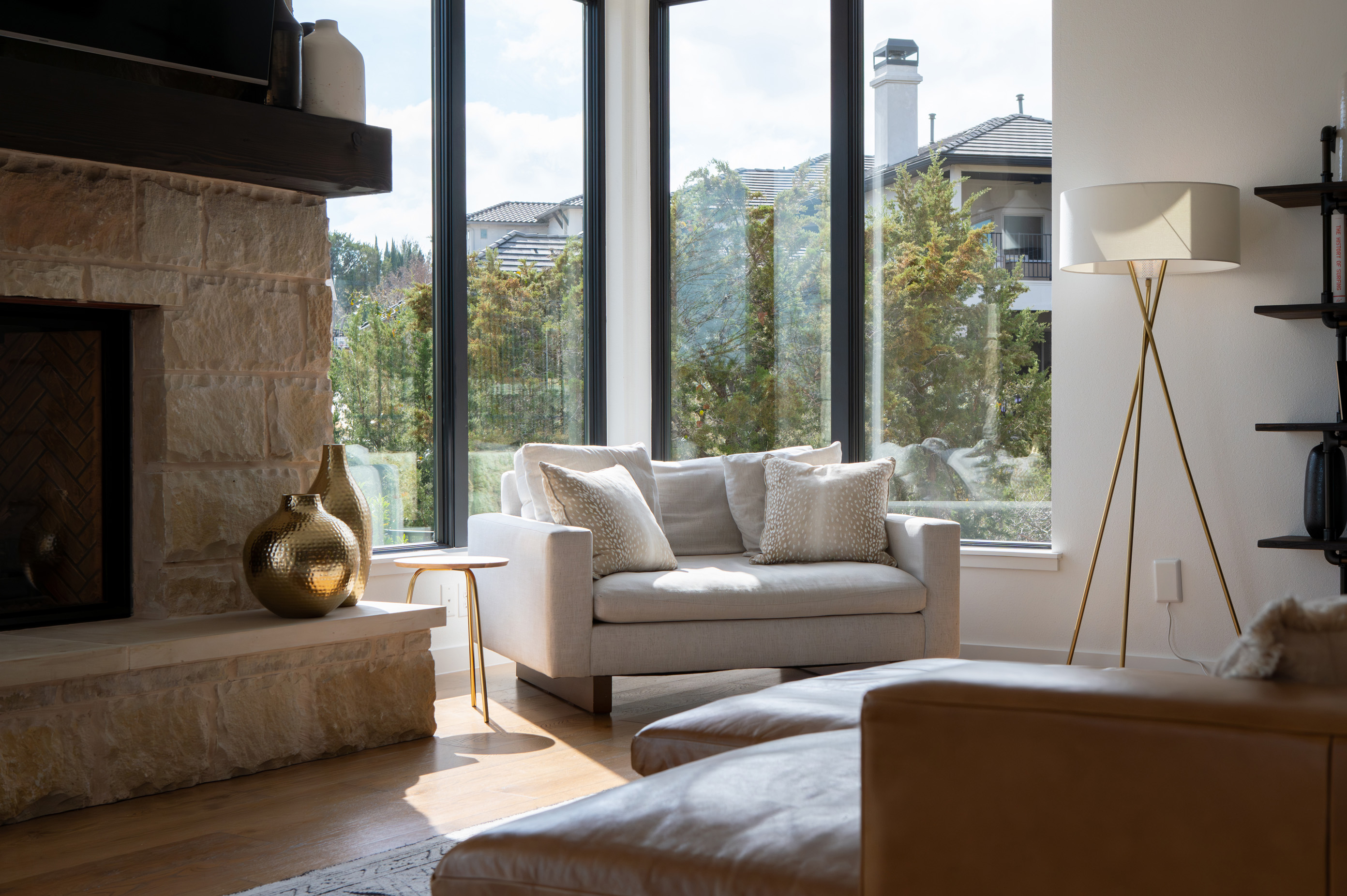 • Floor-to-ceiling stone fireplace with exposed wood beam ceiling detail